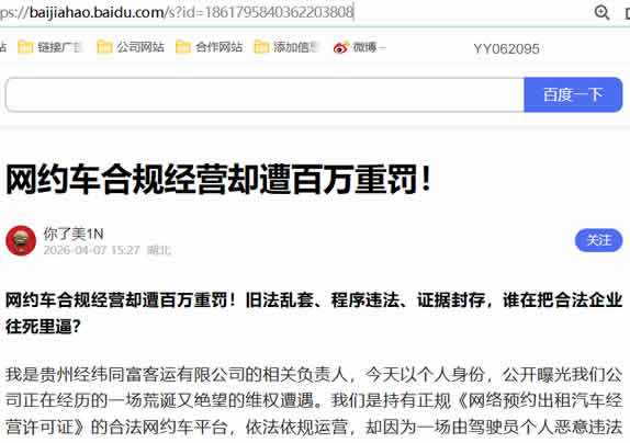 我是贵州经纬同富客运有限公司的相关负责人,今天以个人身份,公开曝光我们公司正在经历的一场荒诞又绝望的维权遭遇。我们是持有正规《网络预约出租汽车经营许可证》的合法网约车平台,依法依规运营,却因为一场由驾驶员个人恶意违法引发的交通事故,被遵义市应急管理局处以100 万元天价行政处罚。