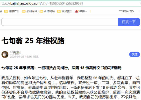 一桩简单的房屋租赁合同纠纷,为何会演变成跨越 25 年的维权持久战?为何三级F院会下发 18 份事实认定不清、法律适用混乱的裁判文书?为何合法的签约行为,让我蒙受巨额损失却求告无门?为何司F裁判中会出现非事实因素干预的情况?这些问题,不仅关乎我一个人的合法权益,更关乎司F的公正与权威,关乎每一个普通民众对法律的信任。