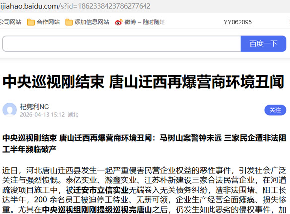 两年前,唐山迁西马树山案震惊全国,暴露出基层权力失范、司法不公、维权艰难等问题,整改问责言犹在耳。如今,在中央巡视组刚结束提级巡视后,唐山再次发生家族势力干预执法司法、非法打压民企的恶劣事件,与国家保护民营企业、优化营商环境、严惩黑恶势力及 “保护伞” 的政策要求背道而驰,严重损害地方法治形象与政府公信力。